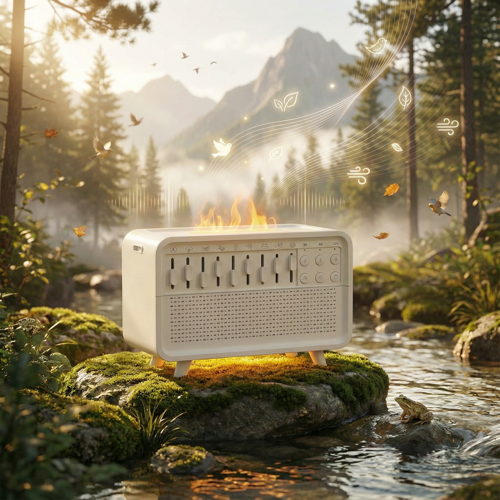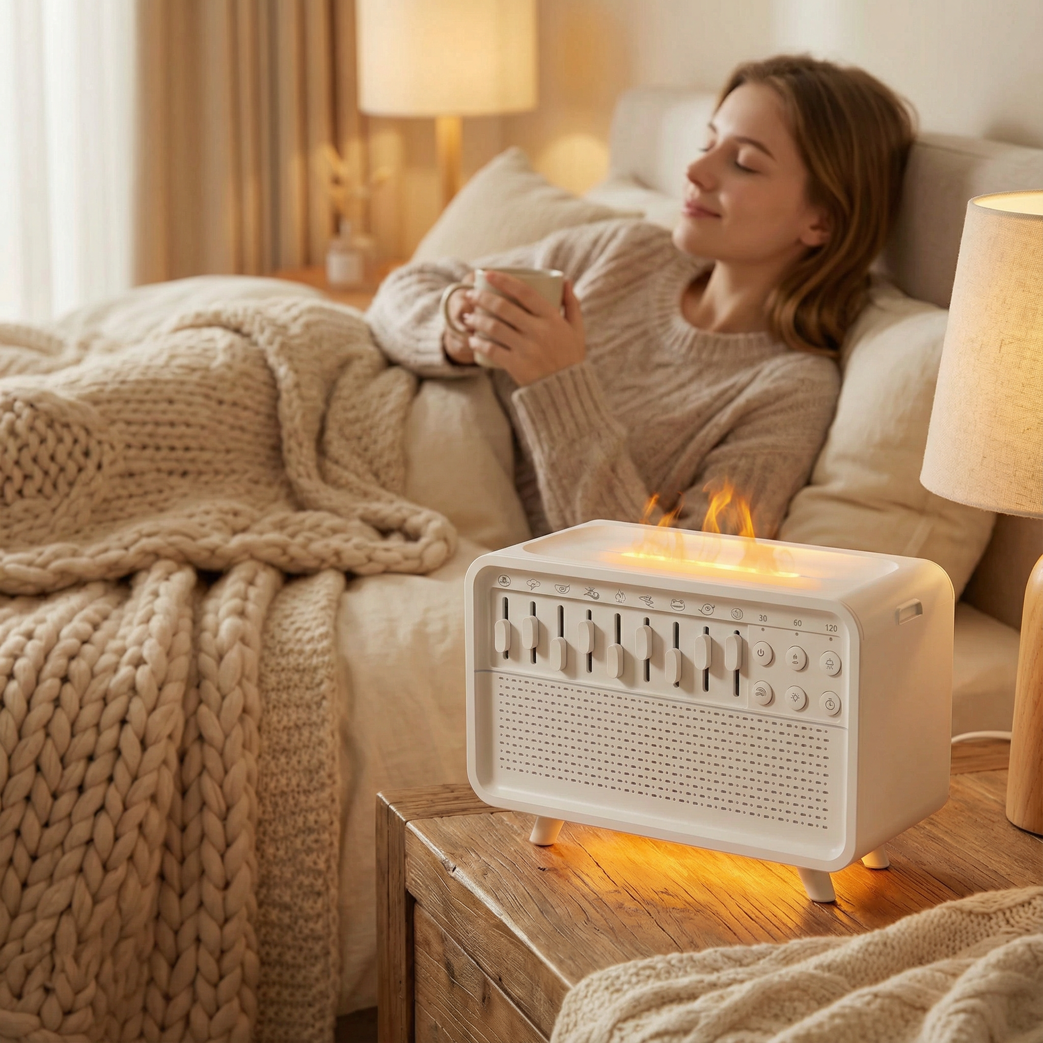 To połączenie kojących dźwięków, efektu kominka, światła i aromaterapii, które zmienia każdy wieczór w prawdziwy rytuał relaksu.
